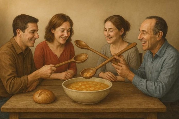 Γύρω από ένα πελώριο τραπέζι καθόντουσαν εκατοντάδες άτομα. Στο κέντρο του τραπεζιού έβλεπες τους πιο λαχταριστούς μεζέδες και, μολονότι όλοι βαστούσαν από ένα κουτάλι που έφτανε ως το κεντρικό πιάτο, πέθαιναν της πείνας! Ο λόγος ήταν ότι τα κουτάλια τους είχαν διπλάσιο μέγεθος από τα χέρια τους και ήταν κολλημένα στις παλάμες τους. Με αυτόν τον τρόπο, όλοι μπορούσαν να φτάσουν το φαγητό, αλλά κανένας δε μπορούσε να το φέρει στο στόμα του.